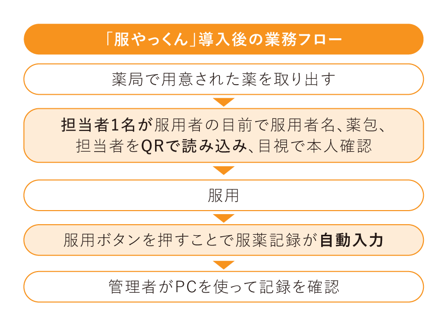 服薬業務にかかる時間の半減と介護員1名分の省人化
