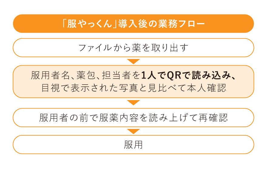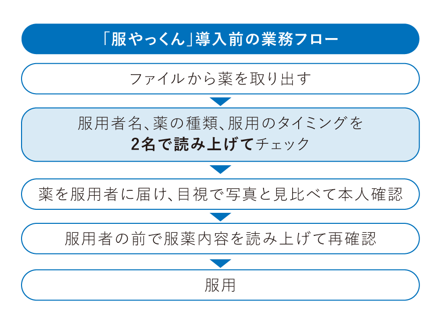 施設開設から5ヶ月経ち、ヒューマンエラーによる誤薬の防止をおもな目的として系列施設で運用実績のある「服やっくん」を導入。